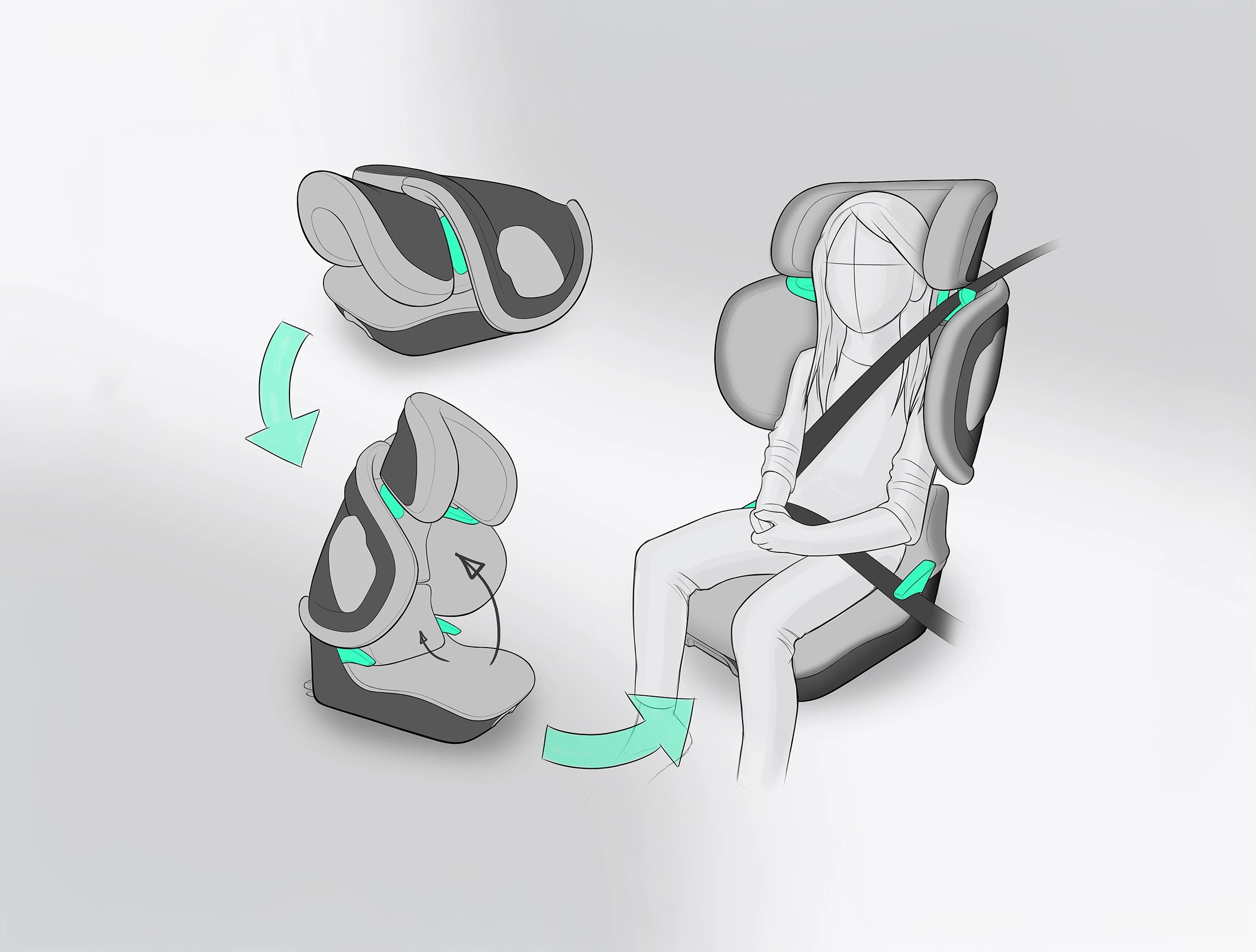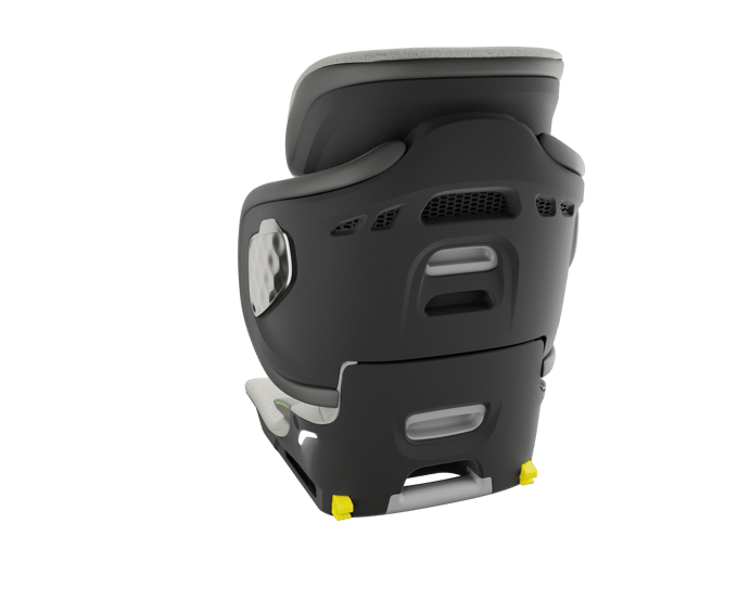 The seat is unique in that it folds into a compact form without compromising on the internal space. The seat is not only extremely lightweight and compact, but it also has several unique features that set it apart from other similar products on the market. Voice-activated LED lights on the base aid in the illumination of the important fitting features during installation. Targeted ventilation to the upper body and neck area improves temperature control and comfort, and super high-tech energy absorbing material is used on the side of the seat for better crash protection.